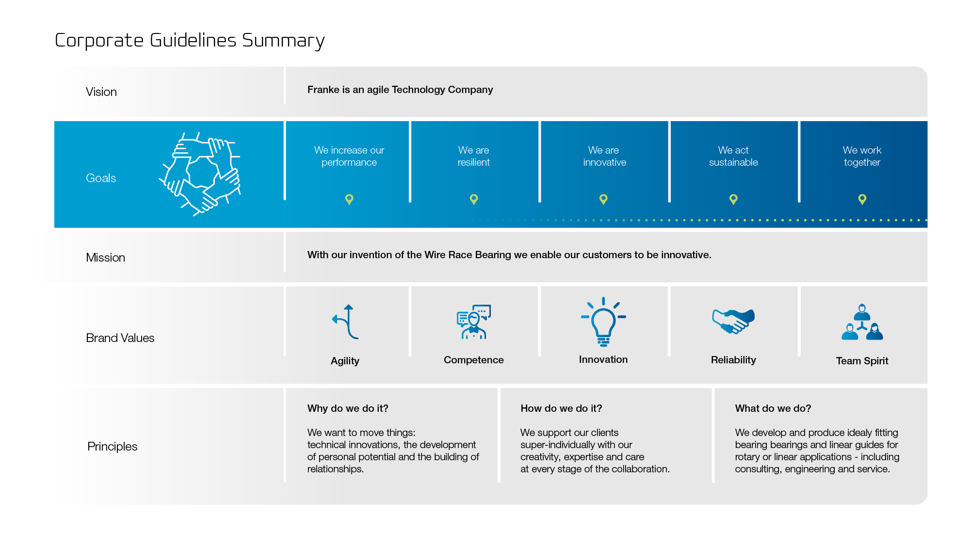 Une charte d'entreprise clairement définie est plus qu'un simple ensemble de mots - c'est la boussole qui guide nos actions et nos décisions au quotidien. Chez Franke GmbH, notre charte est la base de notre quête quotidienne de qualité, d'innovation et de succès durable. Elle reflète nos valeurs, notre mission et notre vision et sert de guide à nos collaborateurs, partenaires et clients.